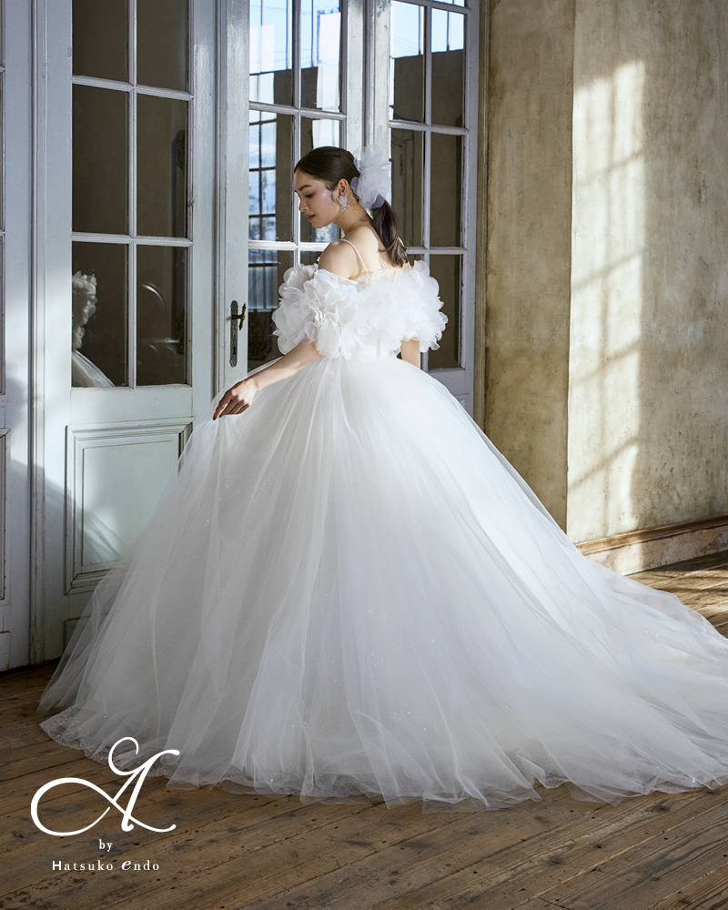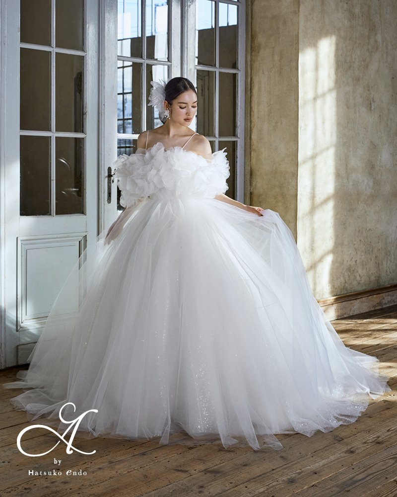 動きのある軽やかなチュールドレスにストラップ付きのフラワーモチーフケープを合わせました。