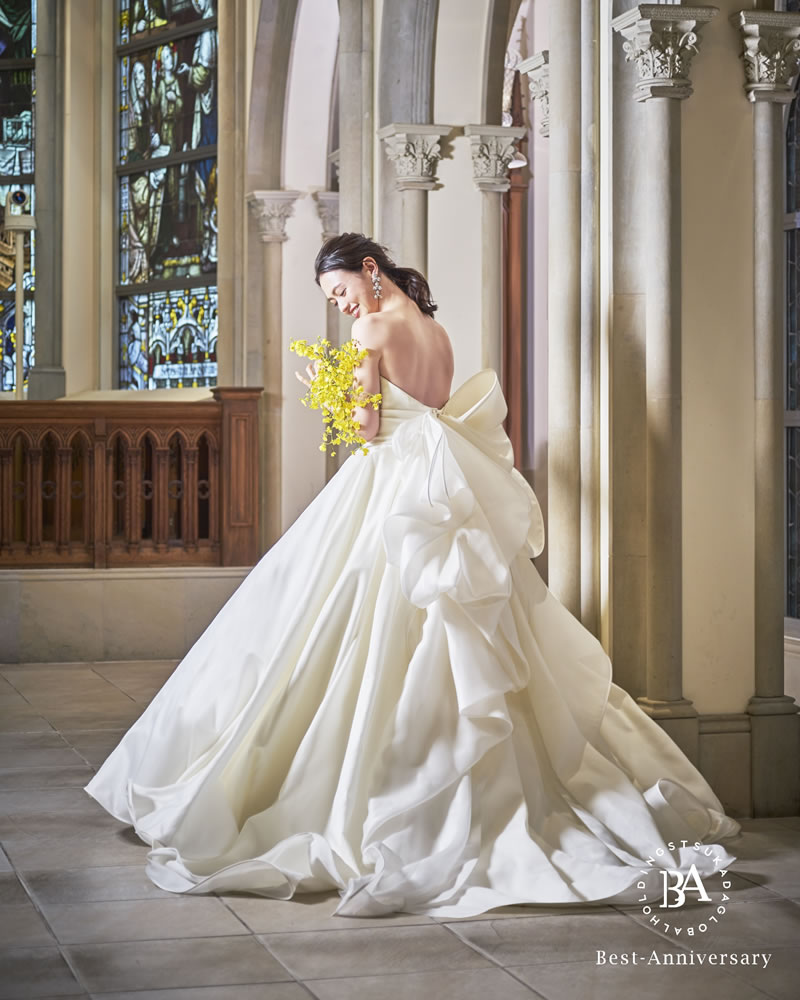 蝶々が羽を広げている様にも見えるバックモチーフが、シンプルなドレスに華やかさを加え、可憐な花嫁像を創り上げます。