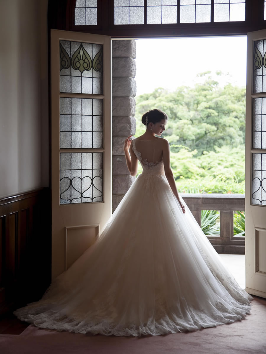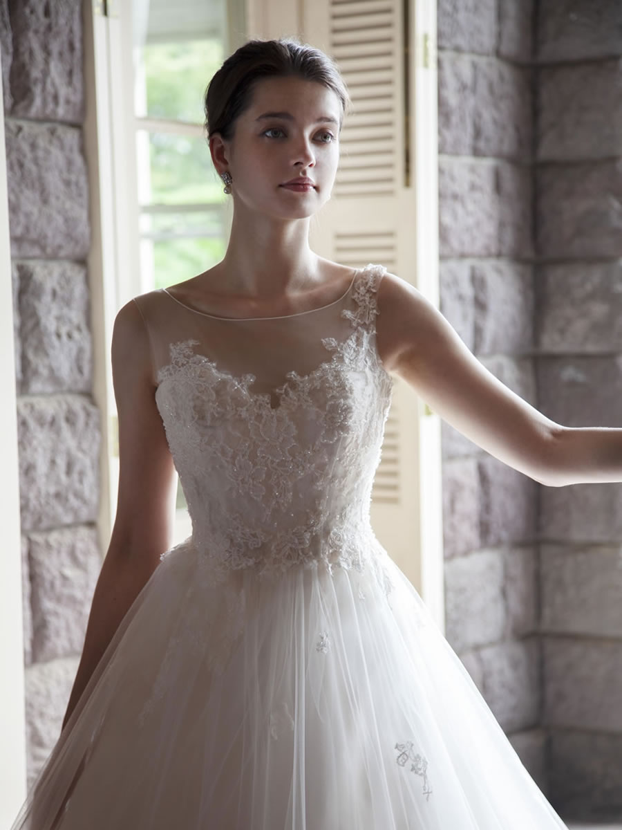 ギャザーをたっぷりと取った透明感溢れるイタリア製ソフトチュールのスカートにリバーレースを裾一周に、更に身頃に向かって立ち上がるような印象でアップリケしました。 トップスは特殊な構造で背中にファスナーがないようにデザイン&パターンメイク、アシメトリーに配置されたレースがシースルー感をより強調しています。