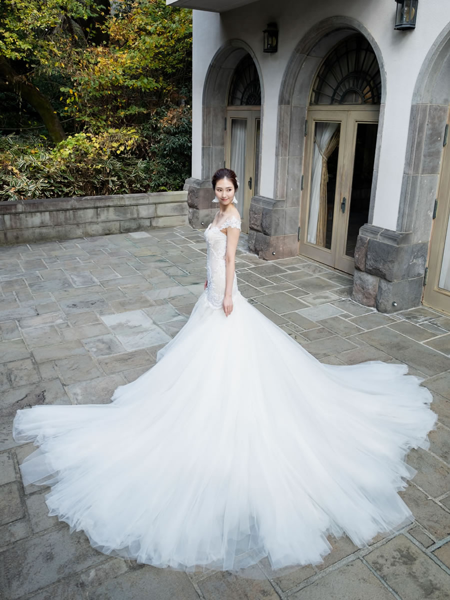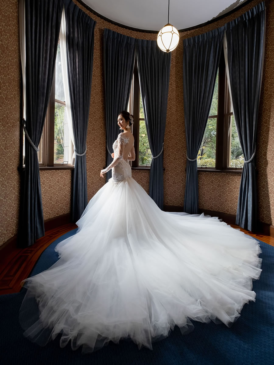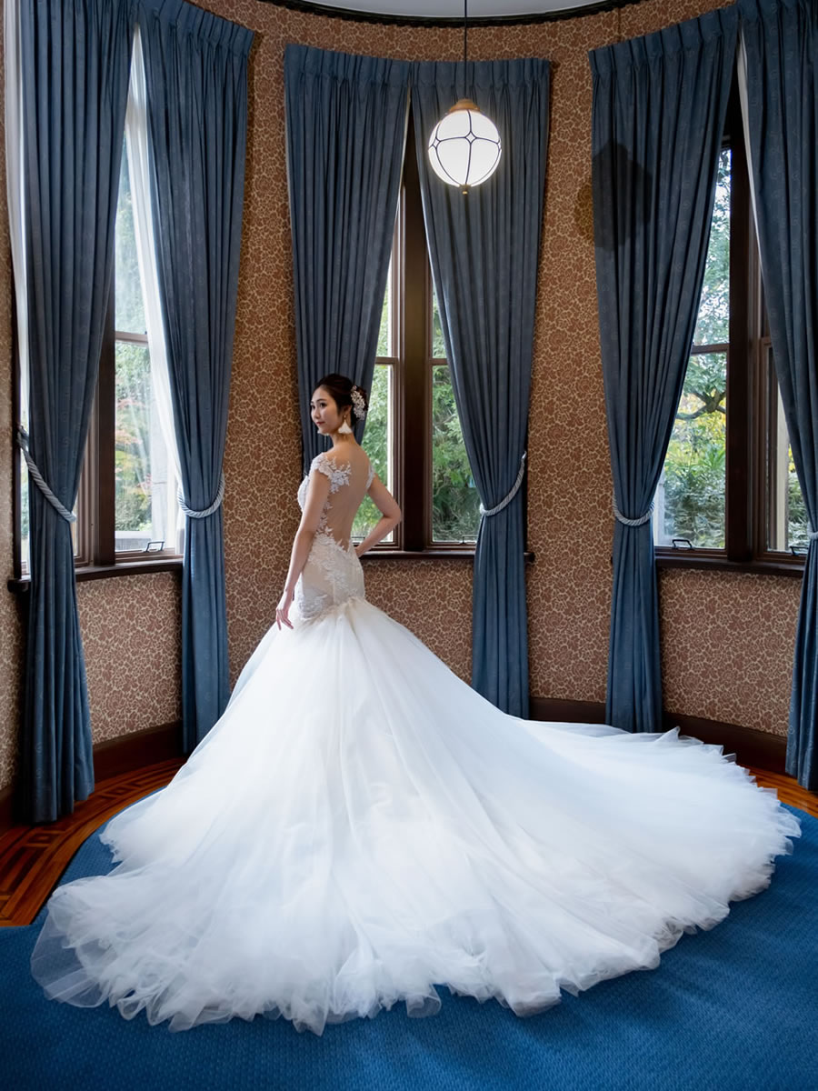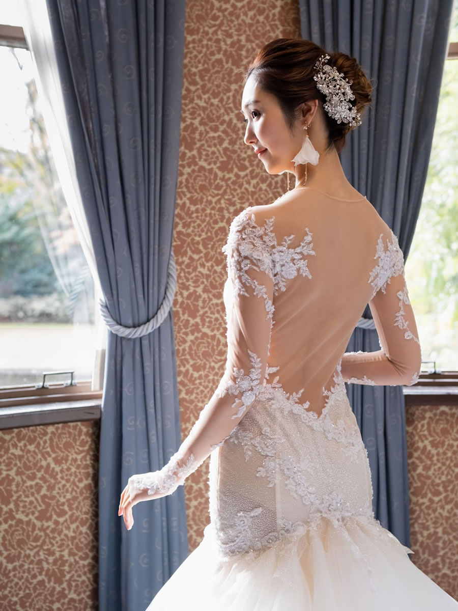 大胆なバックスタイルとシルエットの美しさを求めて作ったマーメイドドレスです。