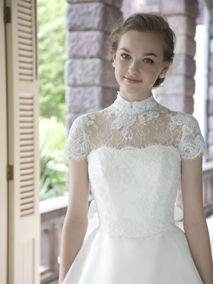 ボレロは、取り外し可能で、上品に首の所までフランス製シャンテリバーレースとフランス製のビージングリバーレースが使われた衿ぐりや胸元上が少し透け感のある半袖タイプのデザインになっています。