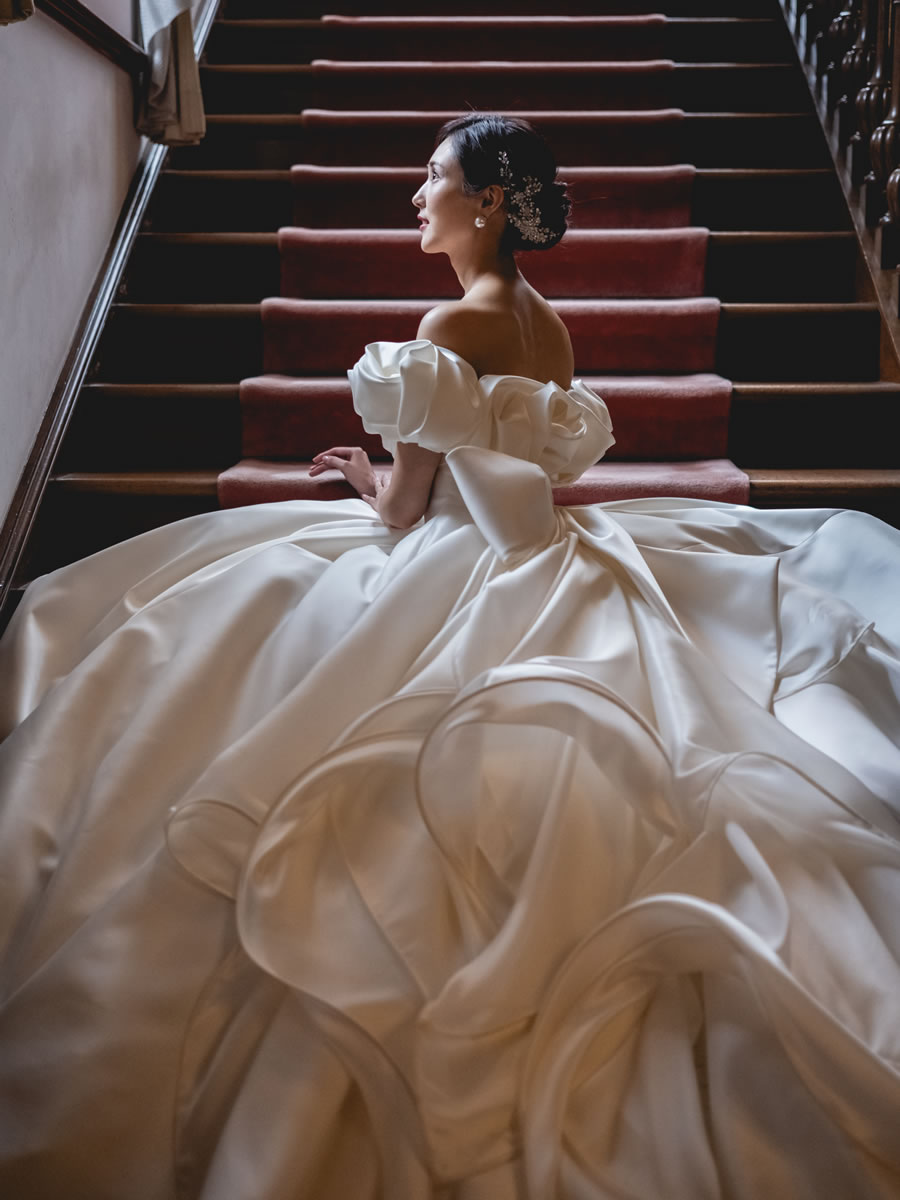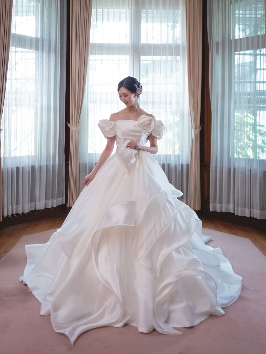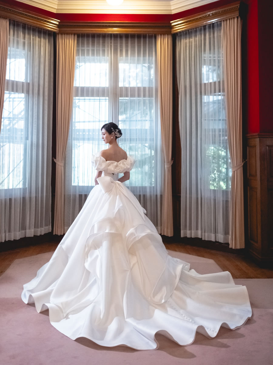 シンプルなAラインのミカドドレスの裾にはホースヘアーを一周取り付けて、うねり感ある裾周りを表現しました。