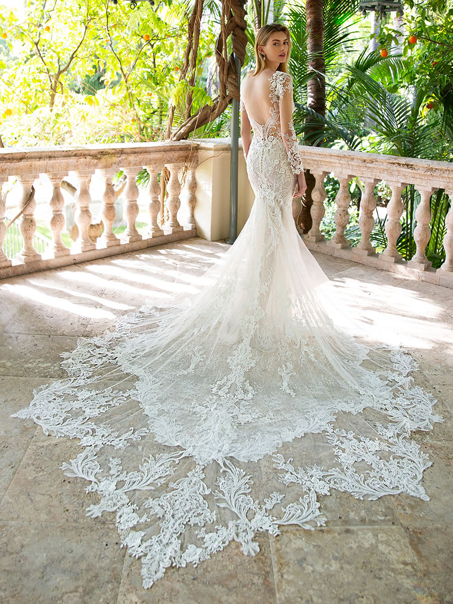ビーズレースは低く開いたVバックを縁取り、Enzoani の特徴である息を呑むような二重のスカラップレースのトレーンに視線を引き付けます。