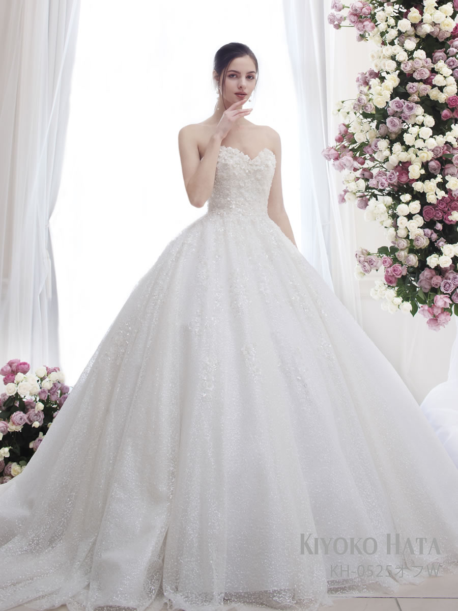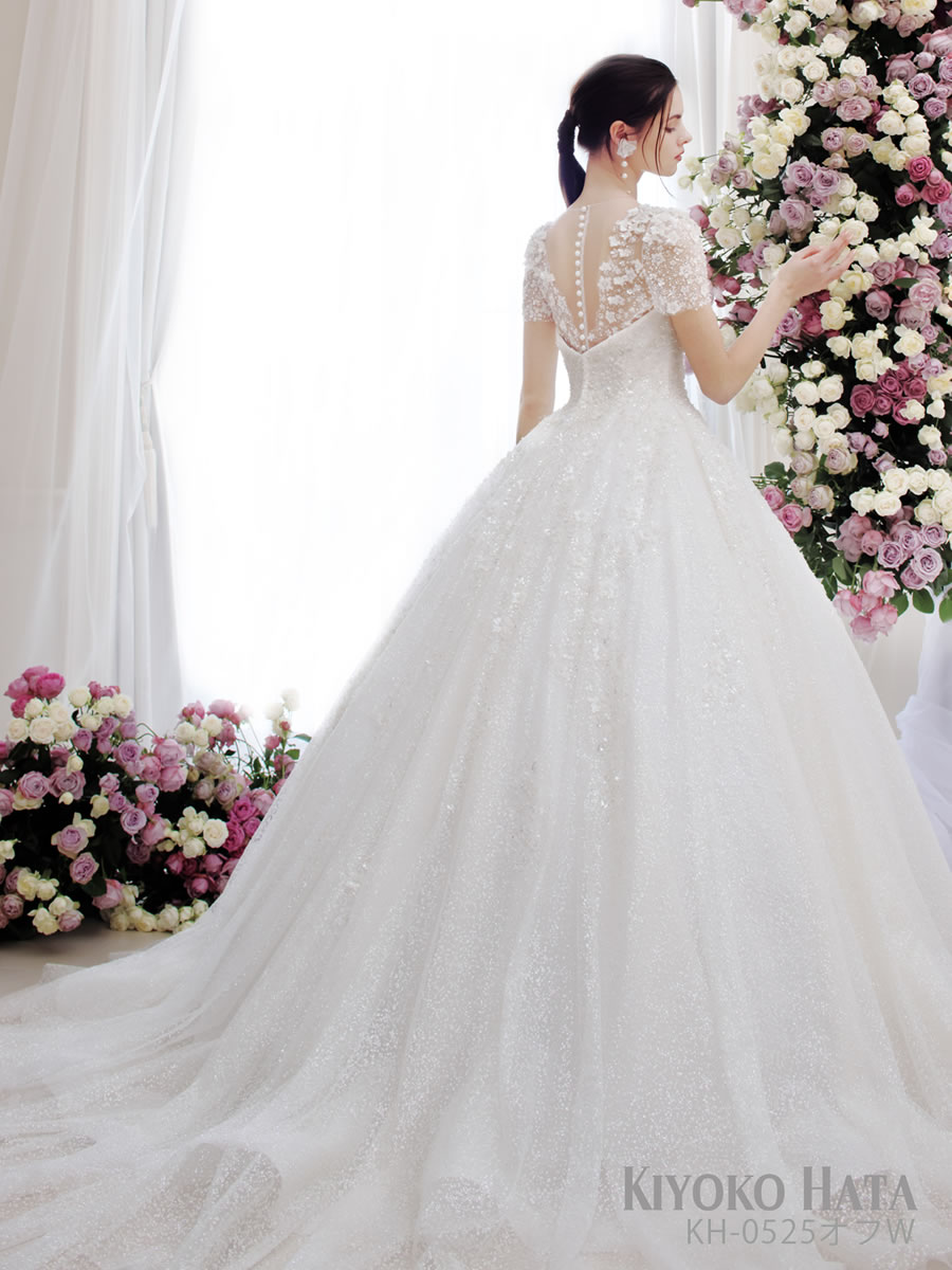 スパンコールの小花のレースをキラキラ輝くグリッター生地の上に立体的に散りばめ、花嫁自身を宝石の様に煌めかせる量感豊かな贅沢Aラインドレス。