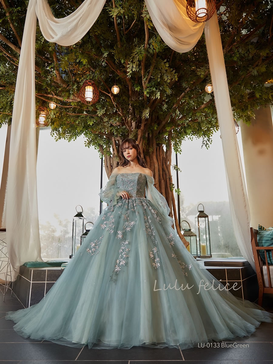 チュールを幾重にも重ねて作り出した絶妙な色合いのセージグリーンが美しい一着。