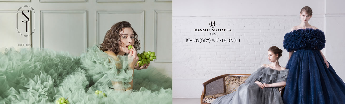 ISAMU MORITA BRIDEブランド設立10周年記念ドレス。艶やかで高級感に溢れたモードサテンのバイカラーカクテルドレス。大人の魅力を感じさせるソフトスレンダ…